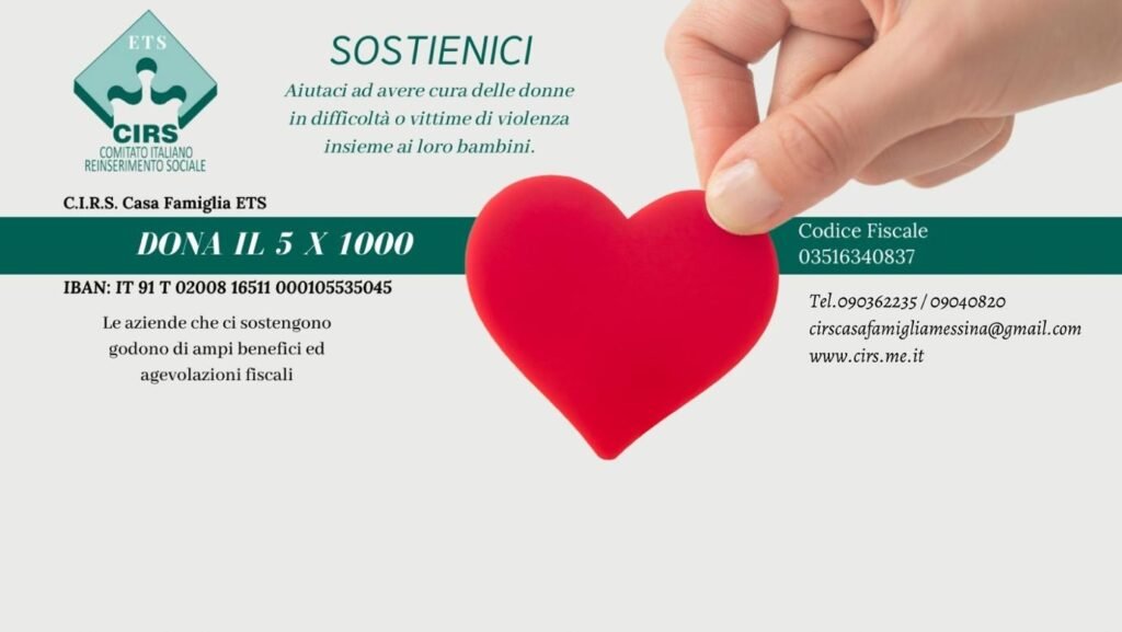 Scegli di donare il 5 per mille al C.I.R.S Casa Famiglia ETS, che accoglie gestanti, ragazze madri, donne donne vittime di violenza con i loro bambini. La nostra mission però non è legata solo all’accoglienza ed all’assistenza, ma anche al reinserimento nella società attraverso la formazione ed il lavoro, per raggiungere la piena autonomia morale e materiale. Codice Fiscale: 03516340837
